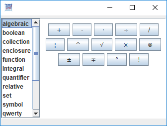 algebraic | + | + - ⋅ ÷ / ¦ ^ √ × ⊗ ± ∓ ° ! |